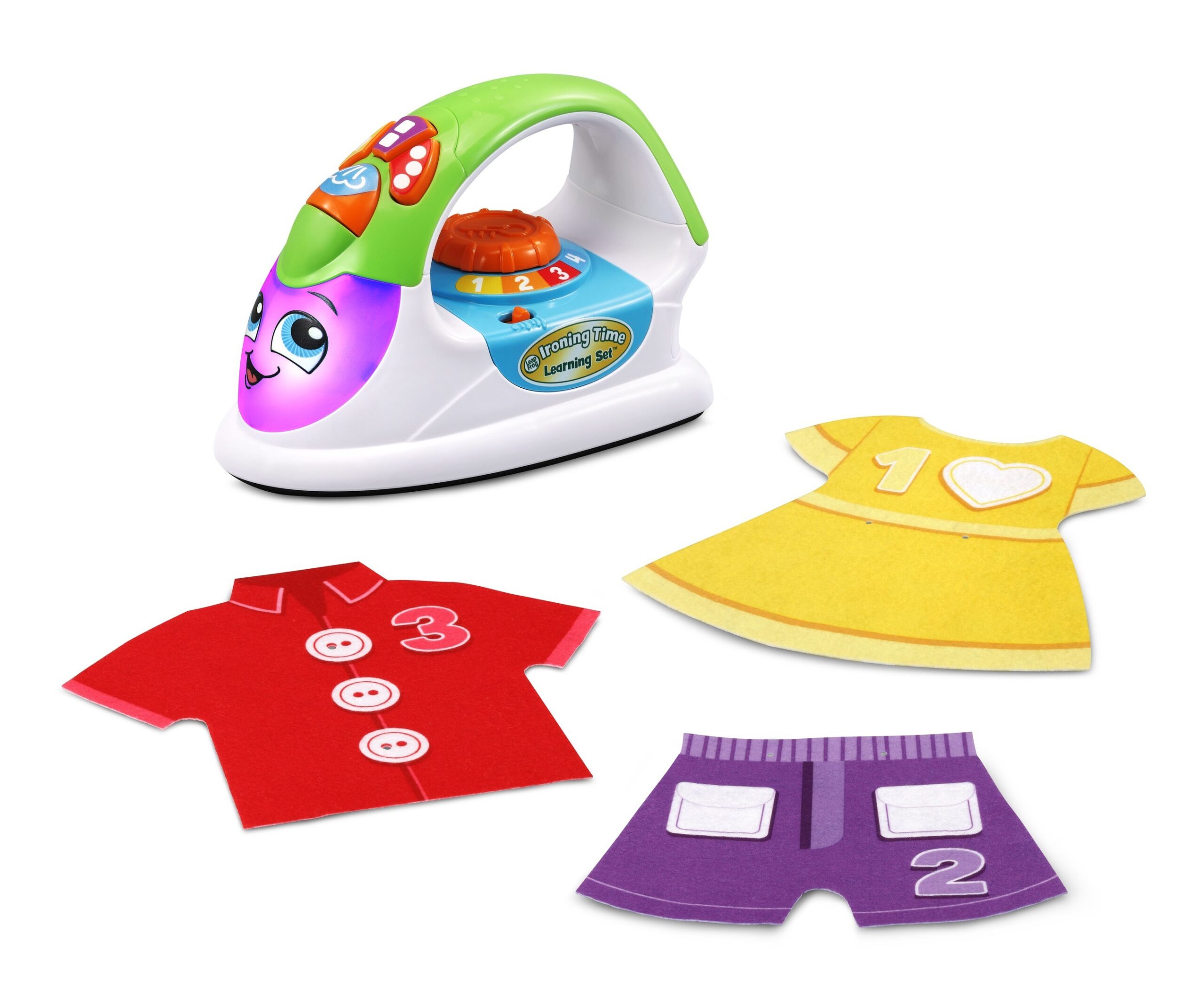 Ironing Time Learning Set™: Press into learning about shapes, colors and counting with the motion-activated Ironing Time Learning Set™! This interactive iron plays songs, silly phrases and sound effects when kids move the iron back and forth. Join the iron in 10+ learning activities! Count to five or sing along to the alphabet song as you iron the included play clothes. Turn the temperature dial to hear about colors, fabrics, and low, medium and high heat. The number one is for low heat, perfect for delicate clothes. Now turn up the heat to watch the light change colors and play steam sound effects! Three buttons show kids numbers, colors and shapes. Press them to hear interactive phrases and questions. Can you find the red shirt? Now iron something with three circles! Watch the iron light up with the color that it names to help kids learn color vocabulary. Hello, yellow! (Ages 18+ months; MSRP: US$14.99)